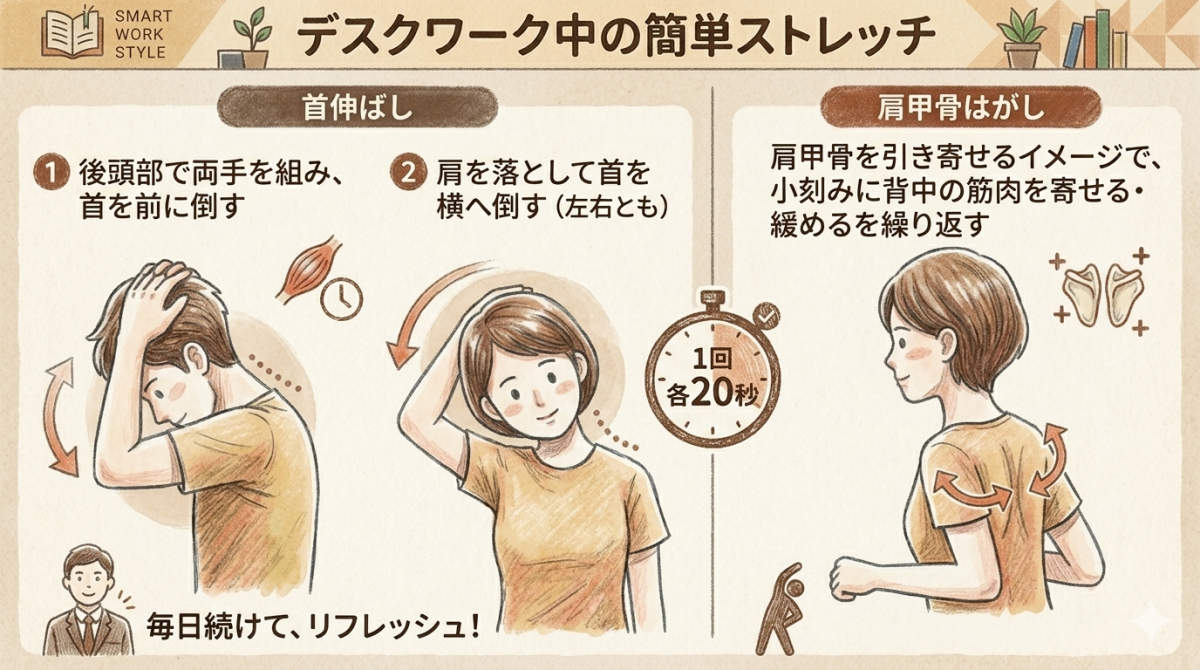 仕事の合間にこまめに伸ばすだけでも、かなり予防になります。